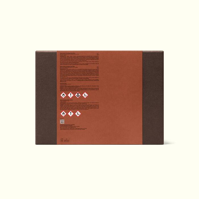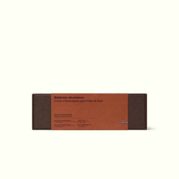 This kit contains a full house of offerings to satisfy the senses in the bathroom and beyond. Beside the basin, Resurrection Aromatique Hand Wash and Hand Balm—citrus, woody and herbaceous—offer suited refreshment and nourishment. Olous Aromatique Room Spray instils olfactory intrigue with its blend of citrus botanicals. And should any unwanted odours drop by, Post-Poo Drops will discreetly shoo them away. Products are housed in a recycled cardboard gift box that is designed to be repurposed once emptied of its original occupants.